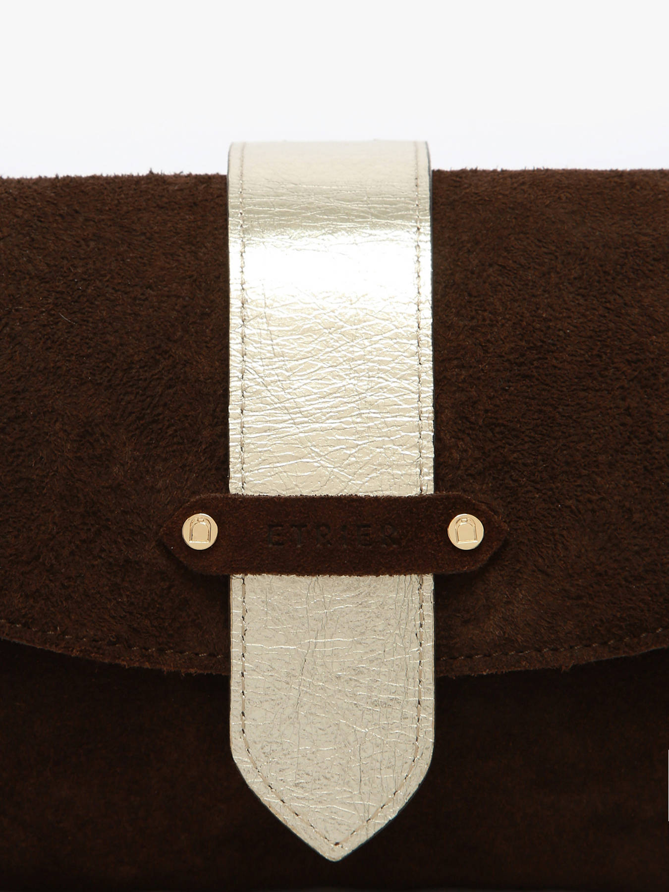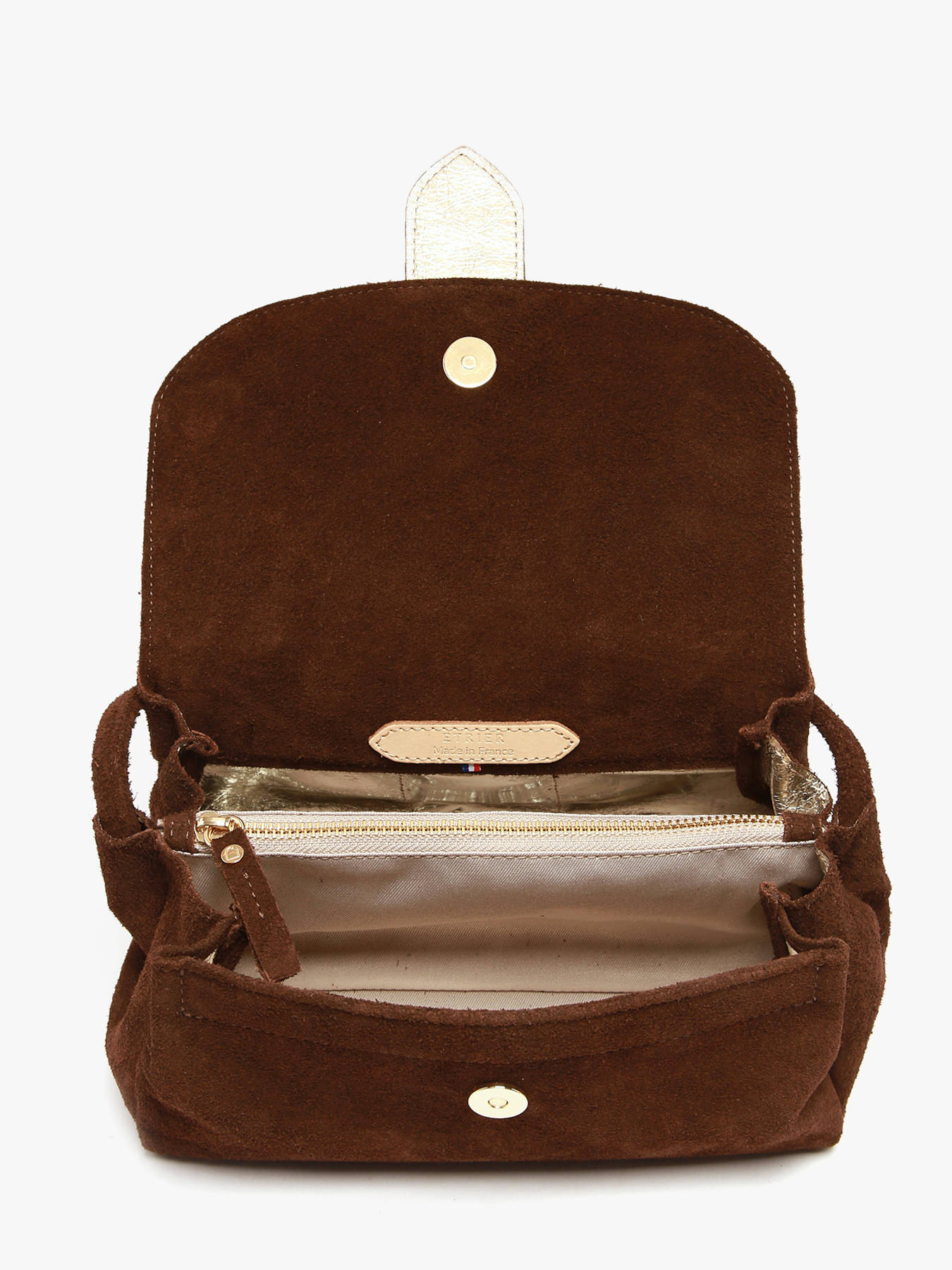 Le sac porté bandoulière AGNES par ETRIER est conçu en cuir velours italien, offrant une texture douce et raffinée. Ce modèle est présenté ici en taille M et se ferme par un rabat doté d'un bouton-pression aimanté. Il existe également en taille S pour celles et ceux qui préfèrent un format plus compact. Le sac est agrémenté d'une languette réversible, composée d'une face dorée et d'une face en cuir assortie au reste du sac. Elle se fixe aisément grâce à deux boutons de col et se glisse dans une poche arrière prévue à cet effet. L'intérieur, entièrement doublé en cuir doré, comprend trois compartiments dont un central zippé, permettant d'organiser vos effets personnels avec confort et élégance. Le fond rigide assure un maintien optimal et une belle tenue au quotidien. Le logo ETRIER, embossé sur du cuir naturel, est accompagné d'un petit drapeau français, symbole discret du savoir-faire artisanal. La bandoulière en cuir est réglée à 130 cm lors de la livraison et peut être ajustée simplement grâce à un nœud placé à l'intérieur du sac. Il suffit de défaire, ajuster puis nouer à nouveau pour obtenir la longueur souhaitée. Ce modèle allie fabrication française, qualité des matières et fonctionnalité élégante. Pour aller encore plus loin dans la personnalisation, retrouvez sur notre site les languettes fantaisie à imprimés animaliers.